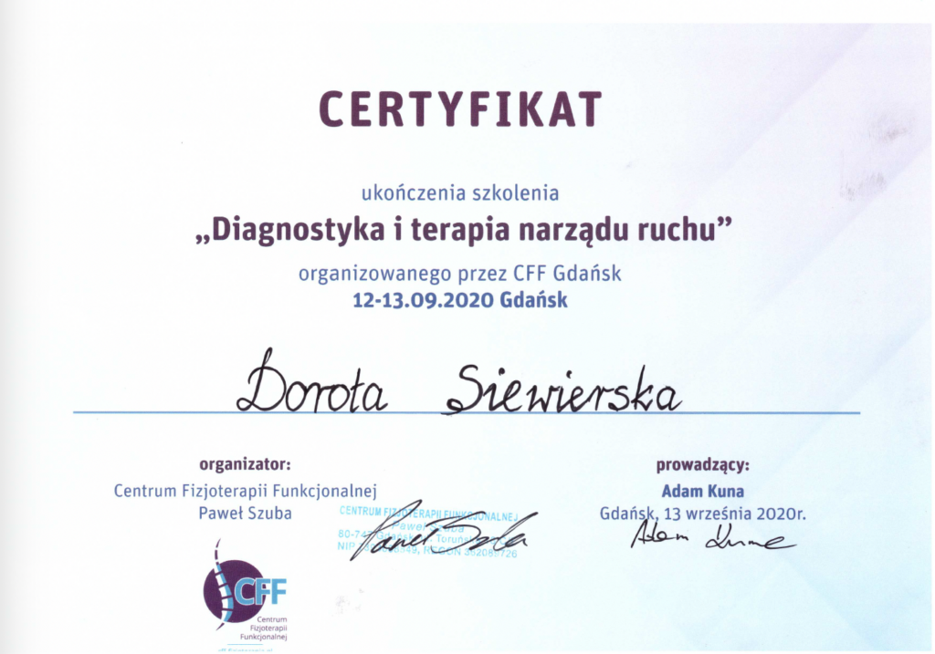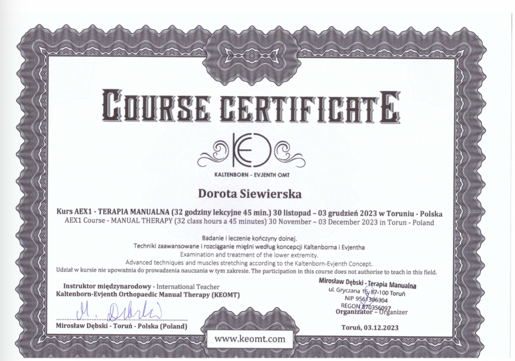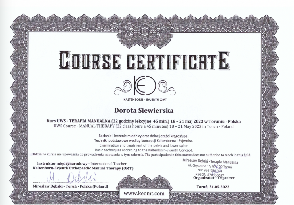 miesiączkowymi i rozejściem kresy białej. W pracy zawodowej wykorzystuje metody terapii manualnej OMT wg koncepcji Kaltenborna i Evjenta oraz Ortopaedic Medicine ETGOM wg Cyriax’a.