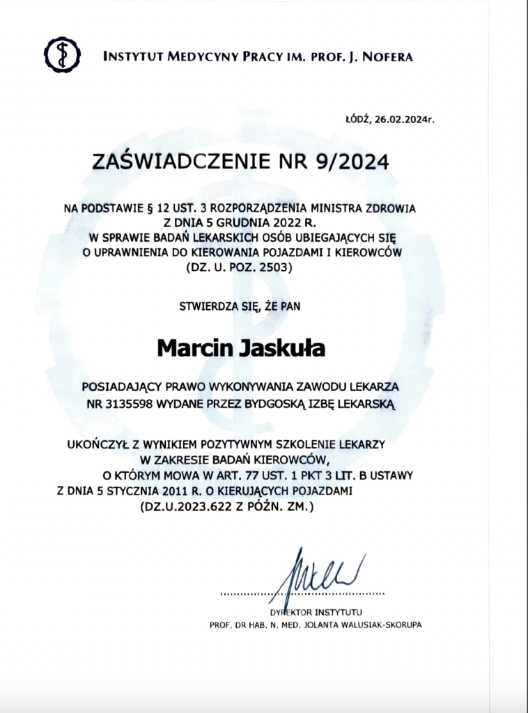Posiadam aktualne uprawnienia do badań lekarskich kierowców oraz kandydatów na kierowców każdej z kategorii.